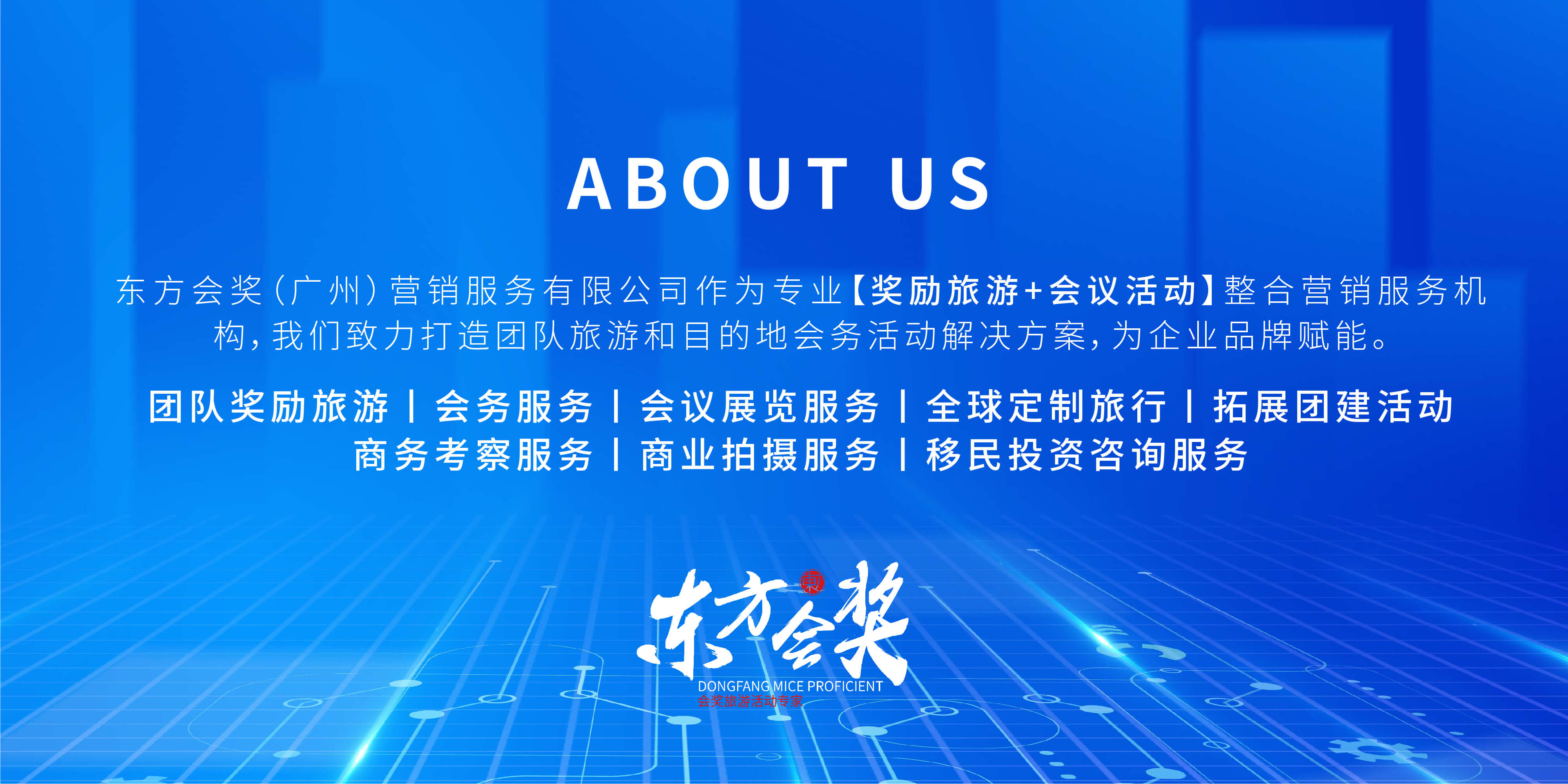 東方會(huì)獎(jiǎng)(廣州)營(yíng)銷服務(wù)有限公司 作為專業(yè)會(huì)獎(jiǎng)旅游活動(dòng)專家,我們致力打造專業(yè)團(tuán)隊(duì)旅游和目的地會(huì)務(wù)會(huì)展解決方案,為企業(yè)品牌賦能。 基于對(duì)商業(yè)客戶需求的深刻理解和豐富的服務(wù)經(jīng)驗(yàn),東方會(huì)獎(jiǎng)成功實(shí)現(xiàn)從單一服務(wù)到整合服務(wù)、從簡(jiǎn)單服務(wù)到高附加值服務(wù)、從線下服務(wù)到覆蓋線上線下的整合營(yíng)銷服務(wù)布局,旗下東方會(huì)獎(jiǎng)、途蘭朵旅行、左契文化、途蘭朵科技、全球開(kāi)拓者等各業(yè)態(tài)的專業(yè)子公司相繼成立。目前,東方會(huì)獎(jiǎng)已經(jīng)在中國(guó)主要經(jīng)濟(jì)區(qū)域建立了完善的服務(wù)網(wǎng)絡(luò),覆蓋廣州、深圳、佛山、杭州、成都、貴陽(yáng)、西安、福州、廈門、桂林、長(zhǎng)沙等核心城市。 成立至今,東方會(huì)獎(jiǎng)一直專注于為新零售、保險(xiǎn)、金融、直銷等機(jī)構(gòu)客戶提供“一站式”整合營(yíng)銷服務(wù),業(yè)務(wù)涵蓋:團(tuán)隊(duì)獎(jiǎng)勵(lì)旅游,目的地會(huì)務(wù)服務(wù),會(huì)議展覽服務(wù),全球定制旅行,拓展團(tuán)建活動(dòng),商務(wù)考察服務(wù),專業(yè)旅行拍攝服務(wù)。為企業(yè)品牌實(shí)現(xiàn)真正的全案整合營(yíng)銷。